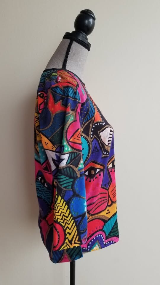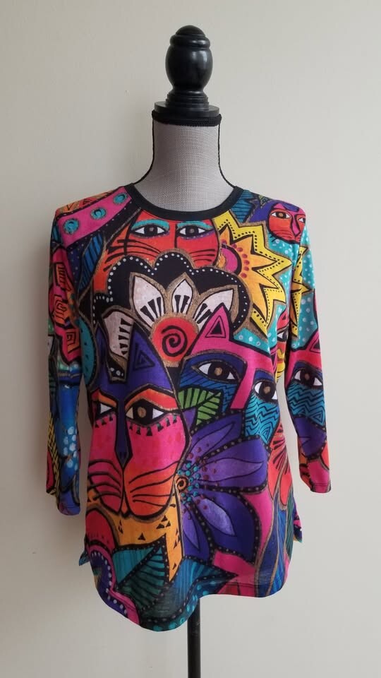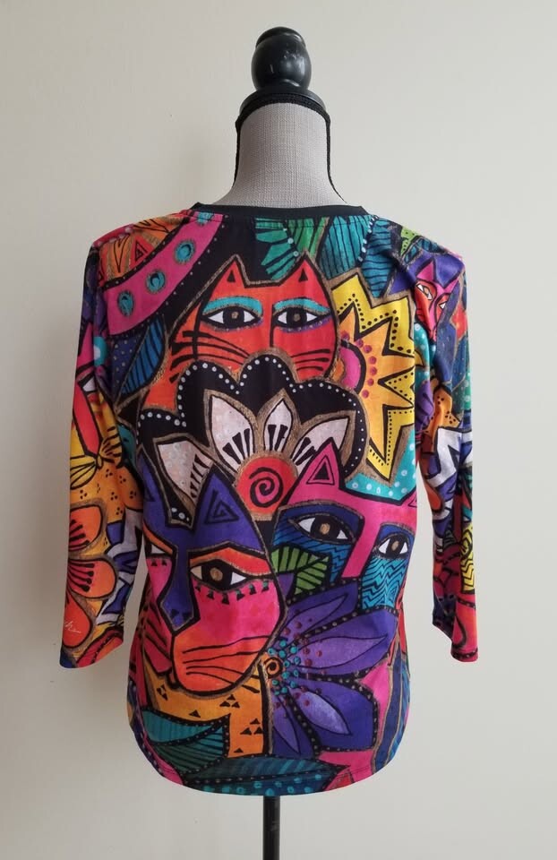 Excellent condition, Laurel Burch Multicolor Abstract Graphic Cat Print Shirt, size L, from pet and smoke-free home, no holds unless etransfer.